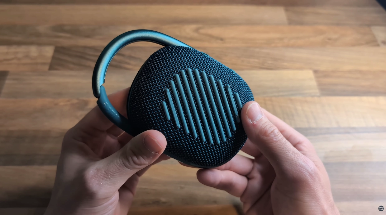 The speaker's standout feature is the integrated heavy-duty carabiner clip. It feels extremely durable and capable of taking a "battering" during outdoor use. The back features a rubberized texture to prevent it from slipping when placed on flat surfaces. Unlike older models, the USB-C port is now open yet remains fully waterproof without needing a rubber cover.